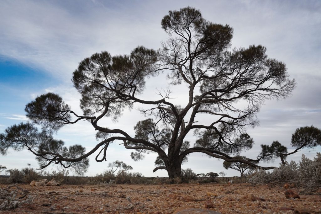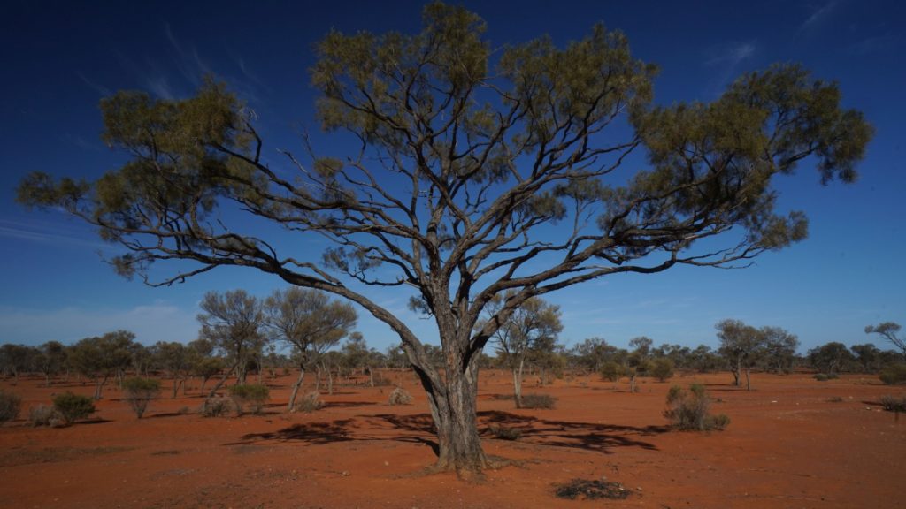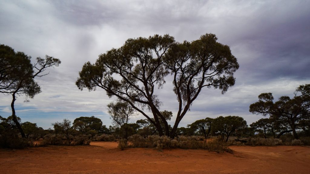 [Western Myalls haben wie Akazien, mit denen sie verwandt sind, keine Blätter. Die Blattstiele übernehmen hier die Assimilationsfunktion der Blätter und die „Blätter“ sind in Wahrheit gar keine Blätter, sondern Blatt-Stiel-Blätter („Phyllodiums“). Wie bei den auch in Deutschland heimischen Wegerichen. Die Phyllodien senken die Transpiration der Western Myalls. Außerdem können die Bäume mit ihren Wurzeln sehr tief gelegenes Wasser anzapfen und sie wachsen seeehr langsam. Western Myalls wachsen nämlich nur, wenn genug Wasser vorhanden ist. Also im Winter. Und so kann es vorkommen, dass nicht wenige der bis zu sieben Meter hohen Bäume so um die 1000 Jahre alt sein können.] Hin und wieder gibt es auch schöne Blumen in der Wüste. [Carpobrotos, die „Pigface-Blume“, überlebt hier wegen ihrer Sukkulenz.]