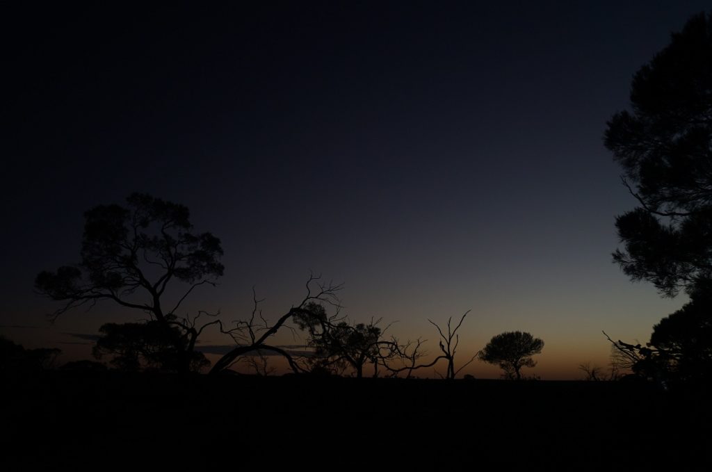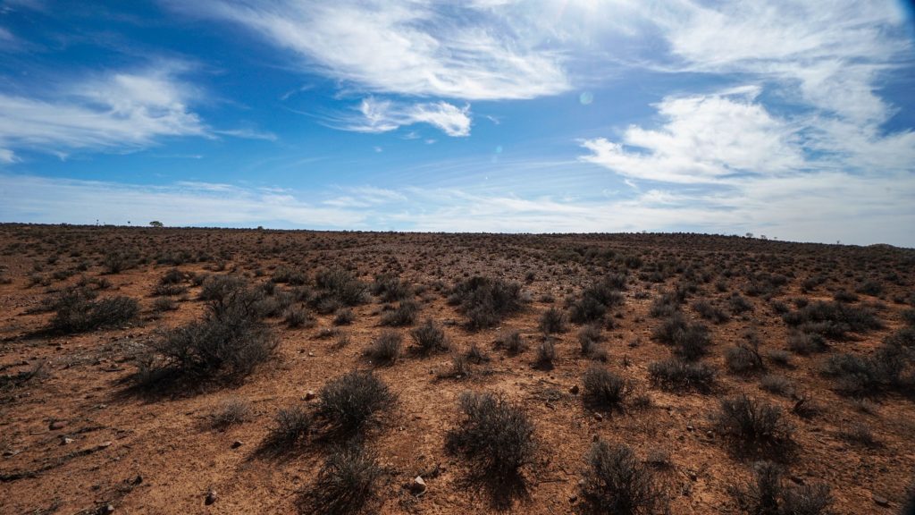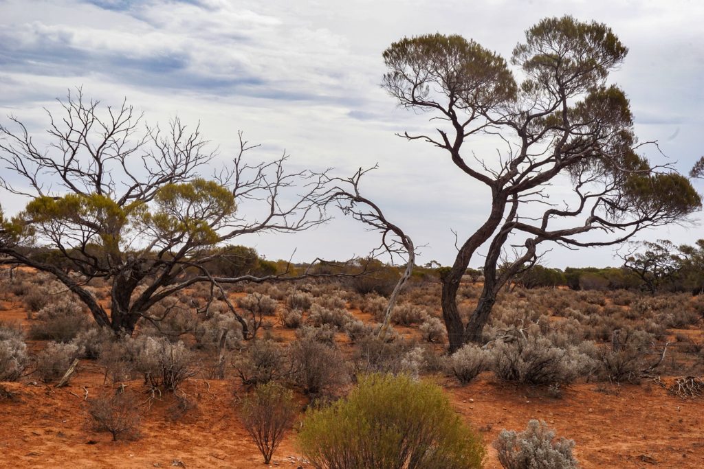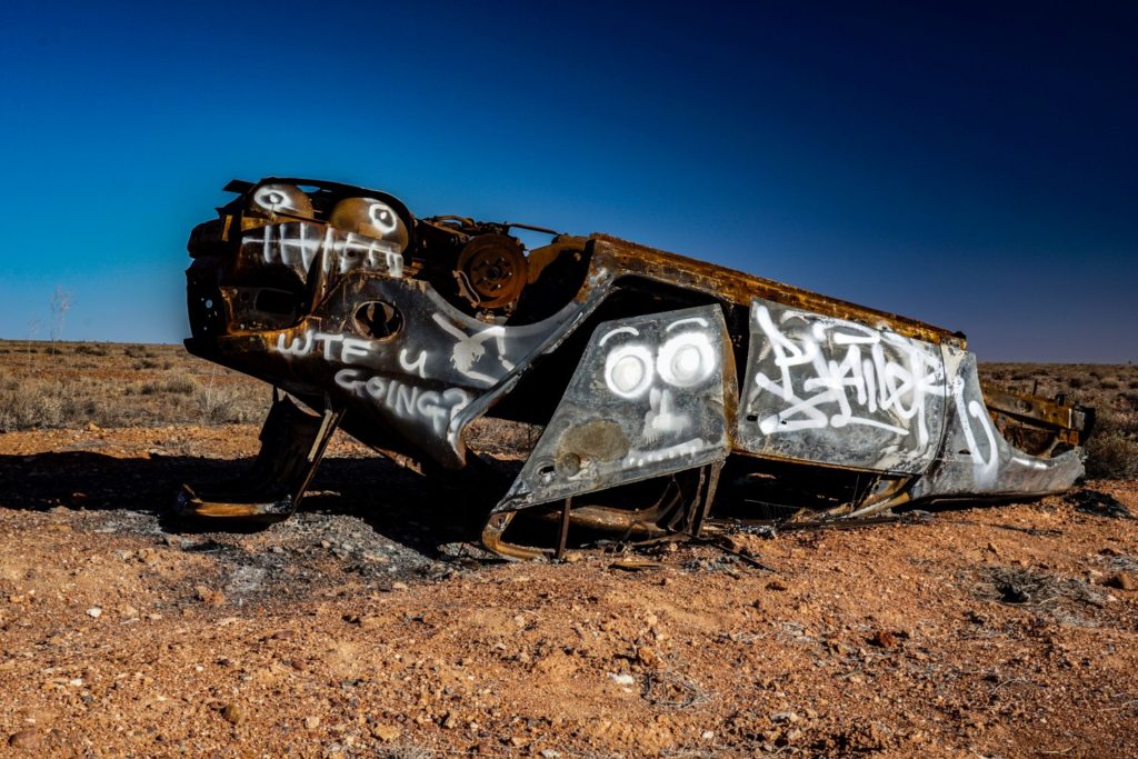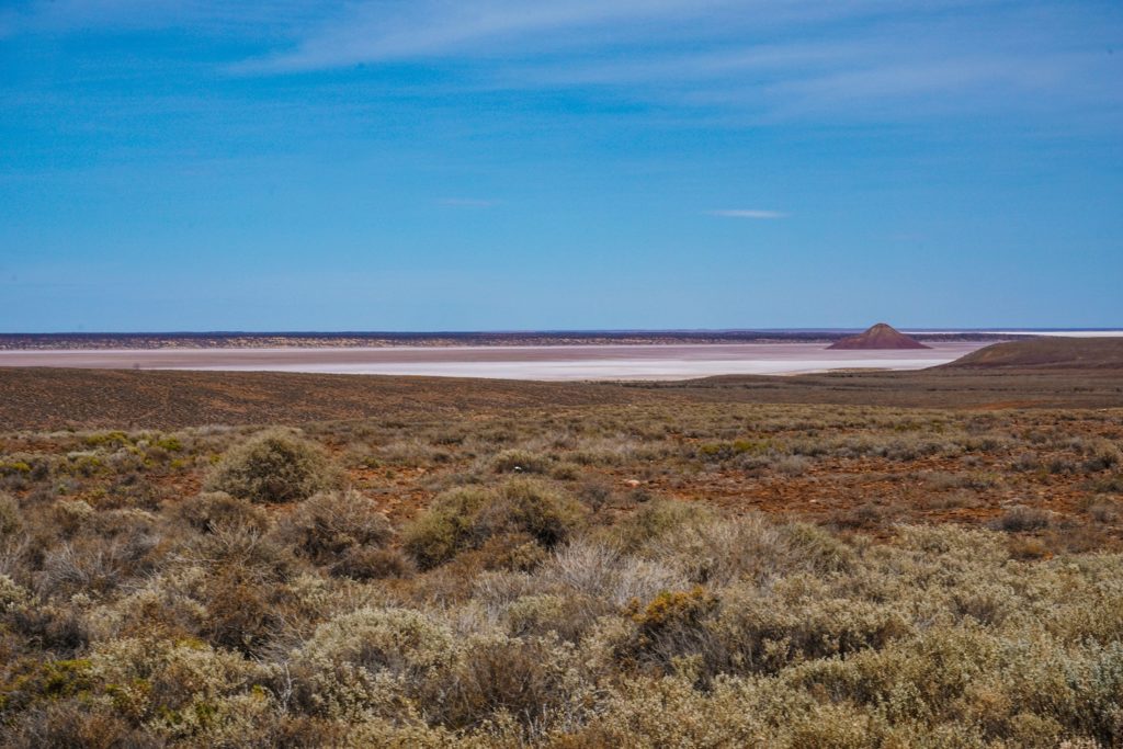 Nach dem obligatorischen Frühstücks-Kaffe packten wir unseren Kram und fuhren weiter. Wir hätten spülen können, oder unser Wasser wegkippen können, denn die nächtste Wasserstelle lag nun in greifbarer Nähe: 10 km. Wir fuhren durch eine wunderschöne und überraschend vielfältige Landschaft und rasteten an der Ranges-View-Rest-Area, wo es auch mal wieder ein rostiges Auto-Wrack zu bestaunen gab. An Pflanzen findet man hier vor allem die grau-blauen Salzbüsche (Chenopods, dazu später mehr) und Western Myall-Bäume (Acacia papyrcarpa).